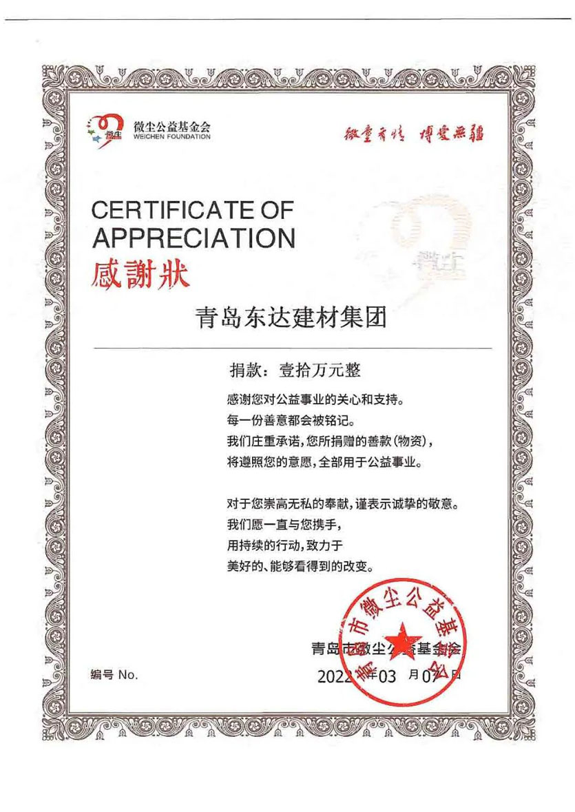 2022年3月7日,青島東達(dá)建材集團(tuán)作為微塵公益基金的理事單位,面對(duì)萊西突如其來(lái)的疫情,關(guān)鍵時(shí)刻伸出援助之手,定向萊西捐款10萬(wàn)元。